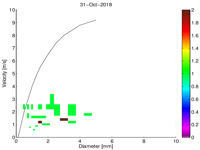Średnie dobowe widmo wielkości i prędkości opadania hydrometeorów na podstawie pomiarów Disdrometrem OTT Parsivel.