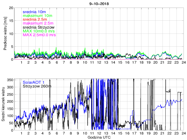 Przebieg dobowy średniej (w okresie 1 min) i maksymalnej predkosci oraz kierunku wiatru na wysokosci 10 i 2.5 metry nad gruntem. Wielkości mierzone na wysokości 10 m pochodza z anemomeru rotacyjnego, zaś na 2.5 m ze stacji WXT520 wysposażonej w anemometr ultradźwiękowy.