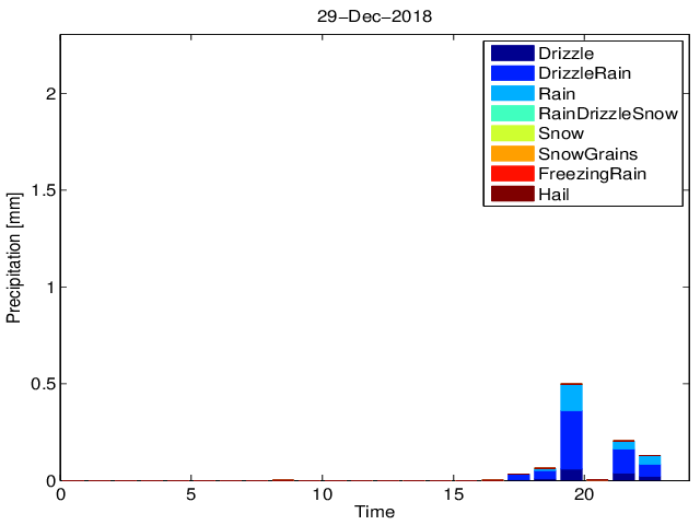 Przebieg dobowy sumy opadu z podziałem na typy hydrometeorów na podstawie pomiarów Disdrometrem OTT Parsivel.