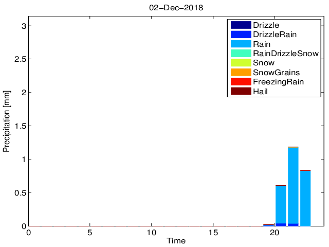 Przebieg dobowy sumy opadu z podziałem na typy hydrometeorów na podstawie pomiarów Disdrometrem OTT Parsivel.