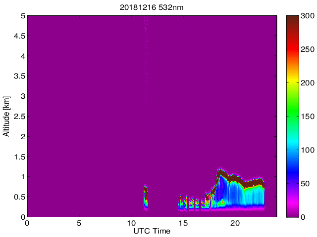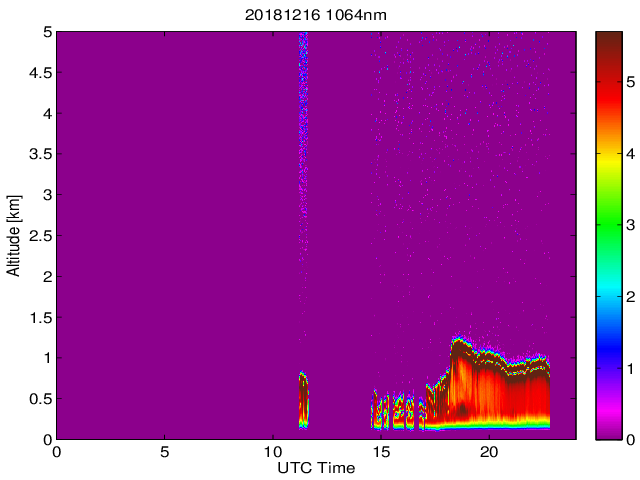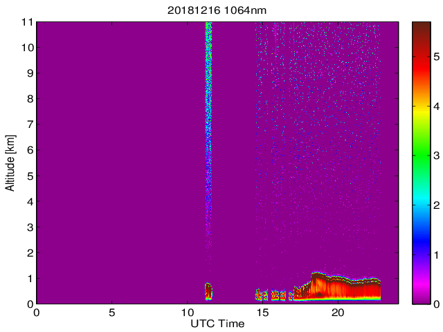Wykres przedstwia sygnał z lidar ADR dla długości fali 1064 nm w zależności od czasu i wysokości nad powierzchnią ziemi. Signał został skorygowany na odleglość od przyrządu (range corrected signal). Sygnał jest poprawny od wysokości ok 550 metrów (powyżej wysokości kompresji geometrycznej. Kolorem czerownym i brązowym widoczne są na mapie chmury.
