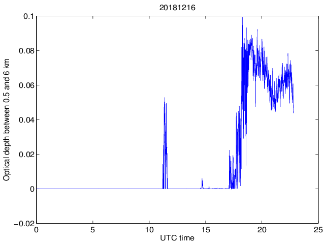 Dobowy przebieg grubości optycznej pomiędzy wysokością 0.5 a 6 km dla długosci fali 1064 nm