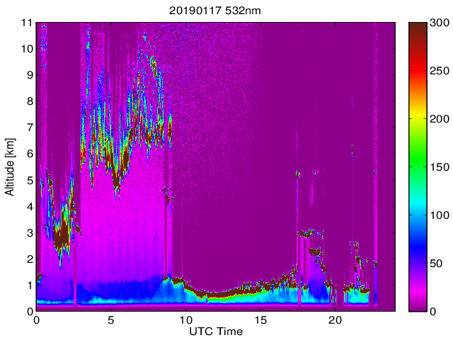 Wykres przedstwia sygnał z lidar ADR dla długości fali 1064 nm w zależności od czasu i wysokości nad powierzchnią ziemi. Signał został skorygowany na odleglość od przyrządu (range corrected signal). Sygnał jest poprawny od wysokości ok 550 metrów (powyżej wysokości kompresji geometrycznej. Kolorem czerownym i brązowym widoczne są na mapie chmury.