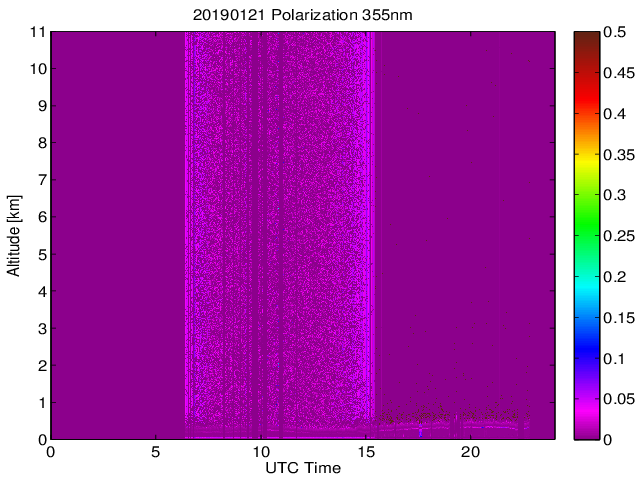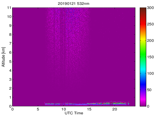 Wykres przedstwia sygnał z lidar ADR dla długości fali 1064 nm w zależności od czasu i wysokości nad powierzchnią ziemi. Signał został skorygowany na odleglość od przyrządu (range corrected signal). Sygnał jest poprawny od wysokości ok 550 metrów (powyżej wysokości kompresji geometrycznej. Kolorem czerownym i brązowym widoczne są na mapie chmury.