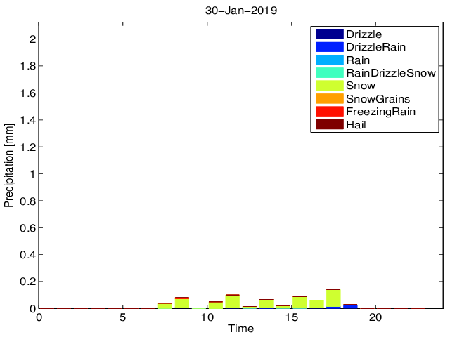 Przebieg dobowy sumy opadu z podziałem na typy hydrometeorów na podstawie pomiarów Disdrometrem OTT Parsivel.