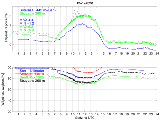 Przebieg dobowy temperatury powietrza na stacji SolarAOT (443 m) i dolnej stacji w Strzyżowie (260 m) oraz wilgotności powietrza mierzonej na stacji SolarAOT dwoma różnymi czujnikami. Różnica temperatur pomiędzy dolną i górną stacją umożliwia określenie stratyfikacji najniższej warstwy granicznej.