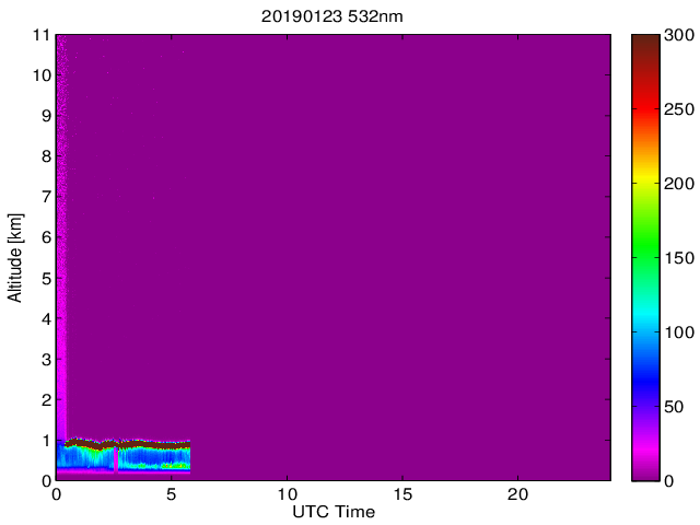 Wykres przedstwia sygnał z lidar ADR dla długości fali 1064 nm w zależności od czasu i wysokości nad powierzchnią ziemi. Signał został skorygowany na odleglość od przyrządu (range corrected signal). Sygnał jest poprawny od wysokości ok 550 metrów (powyżej wysokości kompresji geometrycznej. Kolorem czerownym i brązowym widoczne są na mapie chmury.