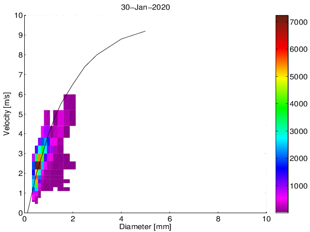 Średnie dobowe widmo wielkości i prędkości opadania hydrometeorów na podstawie pomiarów Disdrometrem OTT Parsivel.