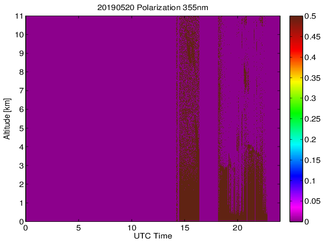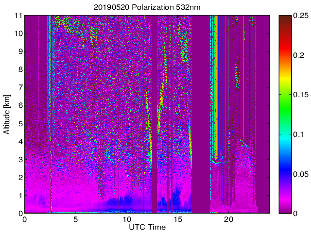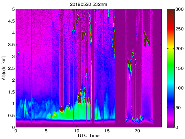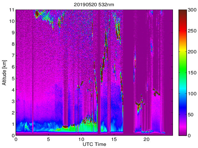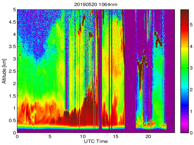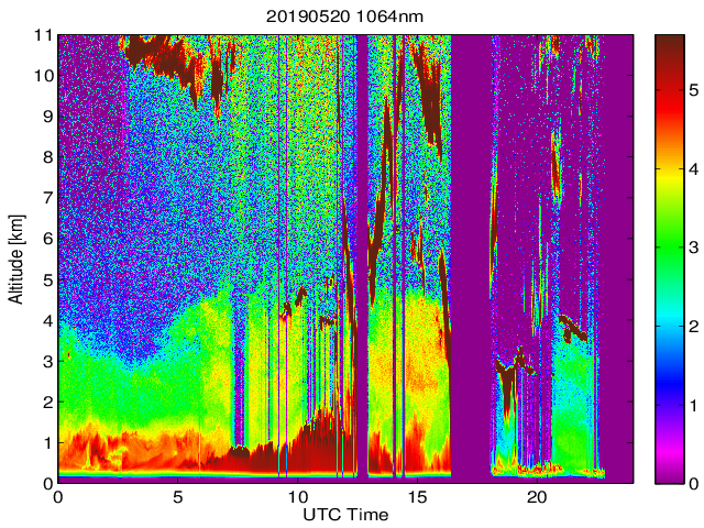 Wykres przedstwia sygnał z lidar ADR dla długości fali 1064 nm w zależności od czasu i wysokości nad powierzchnią ziemi. Signał został skorygowany na odleglość od przyrządu (range corrected signal). Sygnał jest poprawny od wysokości ok 550 metrów (powyżej wysokości kompresji geometrycznej. Kolorem czerownym i brązowym widoczne są na mapie chmury.