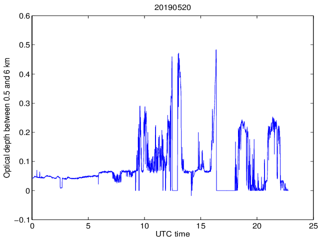 Dobowy przebieg grubości optycznej pomiędzy wysokością 0.5 a 6 km dla długosci fali 1064 nm