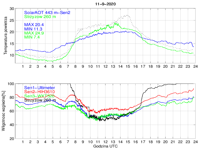 Przebieg dobowy temperatury powietrza na stacji SolarAOT (443 m) i dolnej stacji w Strzyżowie (260 m) oraz wilgotności powietrza mierzonej na stacji SolarAOT dwoma różnymi czujnikami. Różnica temperatur pomiędzy dolną i górną stacją umożliwia określenie stratyfikacji najniższej warstwy granicznej.