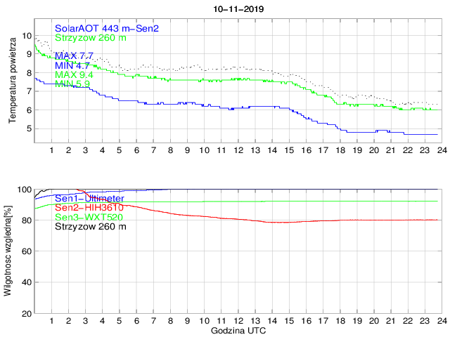 Przebieg dobowy temperatury powietrza na stacji SolarAOT (443 m) i dolnej stacji w Strzyżowie (260 m) oraz wilgotności powietrza mierzonej na stacji SolarAOT dwoma różnymi czujnikami. Różnica temperatur pomiędzy dolną i górną stacją umożliwia określenie stratyfikacji najniższej warstwy granicznej.