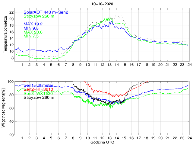 Przebieg dobowy temperatury powietrza na stacji SolarAOT (443 m) i dolnej stacji w Strzyżowie (260 m) oraz wilgotności powietrza mierzonej na stacji SolarAOT dwoma różnymi czujnikami. Różnica temperatur pomiędzy dolną i górną stacją umożliwia określenie stratyfikacji najniższej warstwy granicznej.