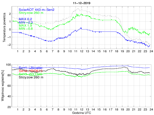 Przebieg dobowy temperatury powietrza na stacji SolarAOT (443 m) i dolnej stacji w Strzyżowie (260 m) oraz wilgotności powietrza mierzonej na stacji SolarAOT dwoma różnymi czujnikami. Różnica temperatur pomiędzy dolną i górną stacją umożliwia określenie stratyfikacji najniższej warstwy granicznej.