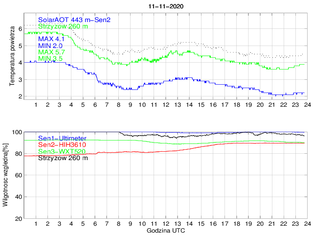 Przebieg dobowy temperatury powietrza na stacji SolarAOT (443 m) i dolnej stacji w Strzyżowie (260 m) oraz wilgotności powietrza mierzonej na stacji SolarAOT dwoma różnymi czujnikami. Różnica temperatur pomiędzy dolną i górną stacją umożliwia określenie stratyfikacji najniższej warstwy granicznej.