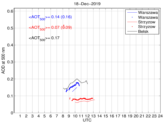 Przebieg dobowy grubości optycznej aerozolu dla długości fali 500 nm. Wielkość mierzona przy użyciu MFR-7 ShadowBand i fotometru CIMEL. Wartości podane na wykresie odnoszą się do średnich wartości za dany okres czasu.