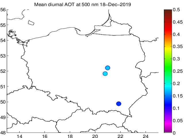 Zmiany przestrzenne grubości optycznej aerozolu dla długości fali 500 nm. Wielkość mierzona przy użyciu MFR-7 ShadowBand i fotometru CIMEL. Wartości podane na wykresie odnoszą się do średnich wartości za dany okres czasu.