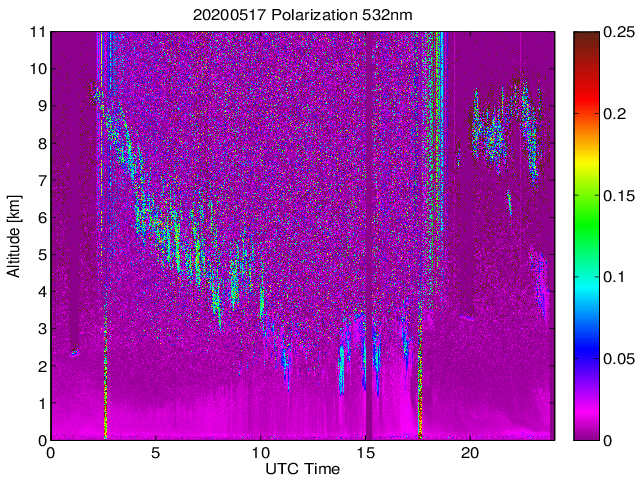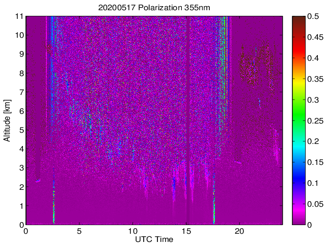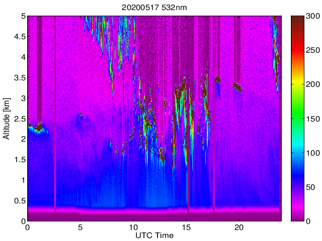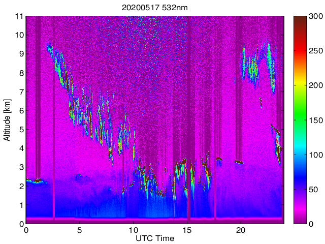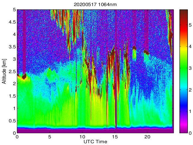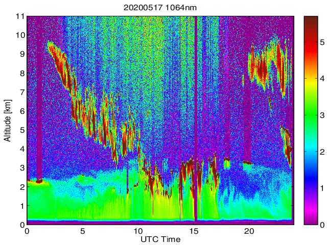 Wykres przedstwia sygnał z lidar ADR dla długości fali 1064 nm w zależności od czasu i wysokości nad powierzchnią ziemi. Signał został skorygowany na odleglość od przyrządu (range corrected signal). Sygnał jest poprawny od wysokości ok 550 metrów (powyżej wysokości kompresji geometrycznej. Kolorem czerownym i brązowym widoczne są na mapie chmury.