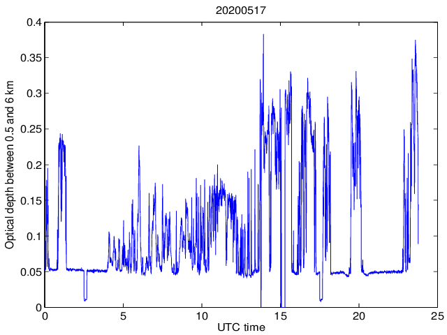 Dobowy przebieg grubości optycznej pomiędzy wysokością 0.5 a 6 km dla długosci fali 1064 nm