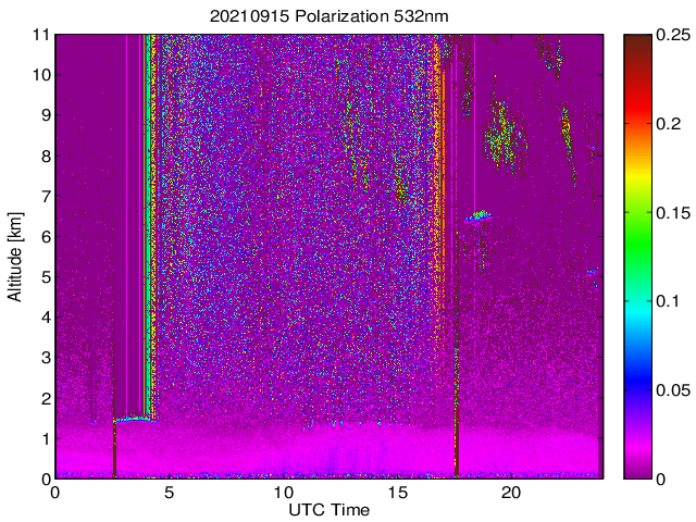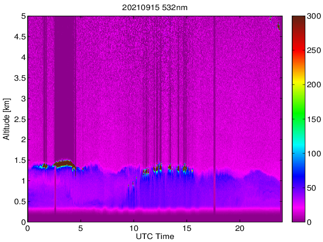 Wykres przedstwia sygnał z lidar ADR dla długości fali 1064 nm w zależności od czasu i wysokości nad powierzchnią ziemi. Signał został skorygowany na odleglość od przyrządu (range corrected signal). Sygnał jest poprawny od wysokości ok 550 metrów (powyżej wysokości kompresji geometrycznej. Kolorem czerownym i brązowym widoczne są na mapie chmury.