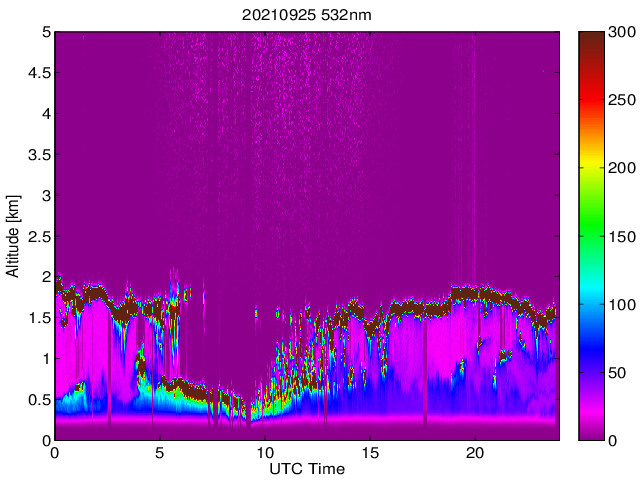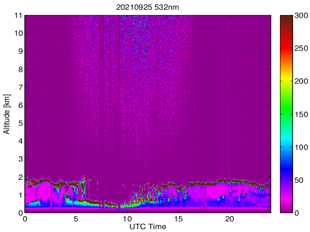 Wykres przedstwia sygnał z lidar ADR dla długości fali 1064 nm w zależności od czasu i wysokości nad powierzchnią ziemi. Signał został skorygowany na odleglość od przyrządu (range corrected signal). Sygnał jest poprawny od wysokości ok 550 metrów (powyżej wysokości kompresji geometrycznej. Kolorem czerownym i brązowym widoczne są na mapie chmury.