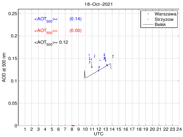 Przebieg dobowy grubości optycznej aerozolu dla długości fali 500 nm. Wielkość mierzona przy użyciu MFR-7 ShadowBand i fotometru CIMEL. Wartości podane na wykresie odnoszą się do średnich wartości za dany okres czasu.