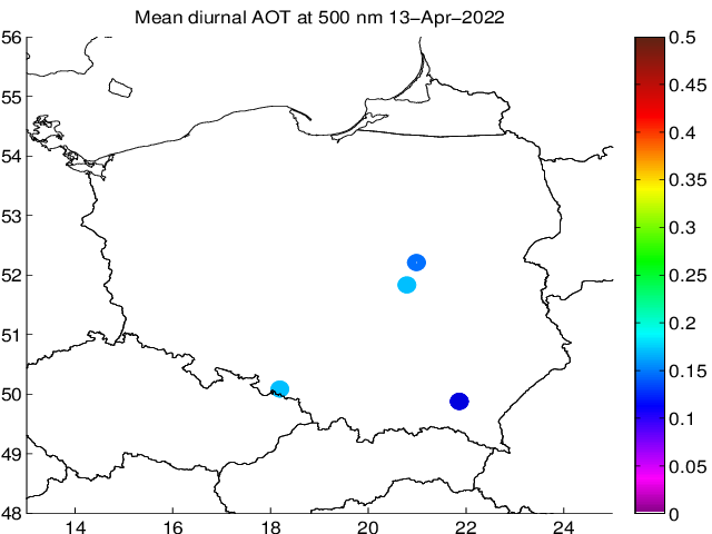 Przebieg dobowy grubości optycznej aerozolu dla długości fali 500 nm. Wielkość mierzona przy użyciu MFR-7 ShadowBand i fotometru CIMEL. Wartości podane na wykresie odnoszą się do średnich wartości za dany okres czasu.