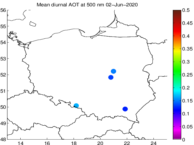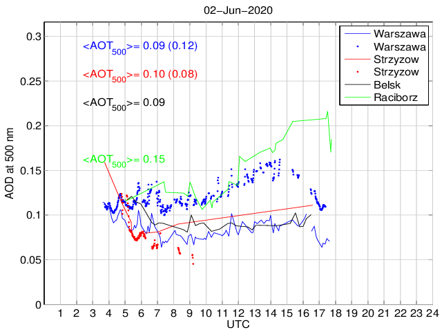 Przebieg dobowy grubości optycznej aerozolu dla długości fali 500 nm. Wielkość mierzona przy użyciu MFR-7 ShadowBand i fotometru CIMEL. Wartości podane na wykresie odnoszą się do średnich wartości za dany okres czasu.