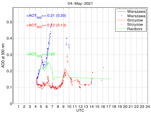 Przebieg dobowy grubości optycznej aerozolu dla długości fali 500 nm. Wielkość mierzona przy użyciu MFR-7 ShadowBand i fotometru CIMEL. Wartości podane na wykresie odnoszą się do średnich wartości za dany okres czasu.