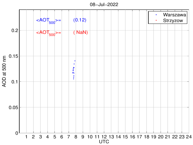 Przebieg dobowy grubości optycznej aerozolu dla długości fali 500 nm. Wielkość mierzona przy użyciu MFR-7 ShadowBand i fotometru CIMEL. Wartości podane na wykresie odnoszą się do średnich wartości za dany okres czasu.