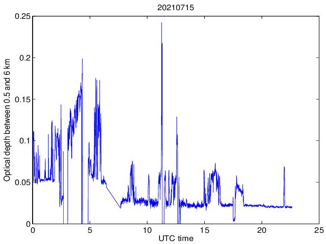 Dobowy przebieg grubości optycznej pomiędzy wysokością 0.5 a 6 km dla długosci fali 1064 nm