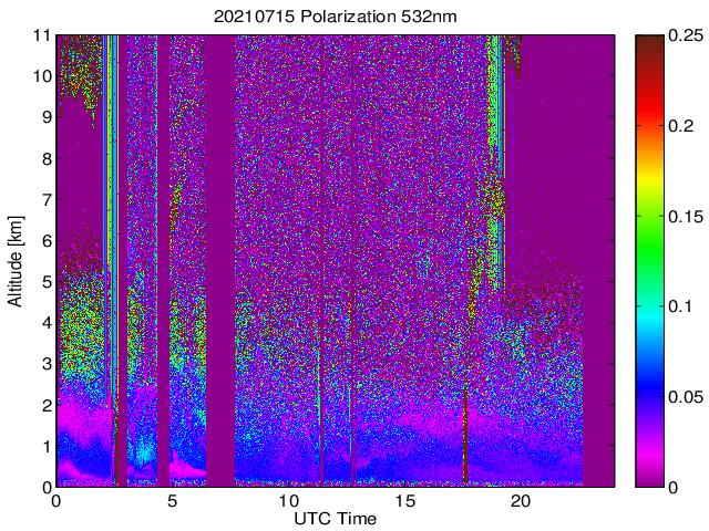 Wykres przedstwia sygnał z lidar ADR dla długości fali 1064 nm w zależności od czasu i wysokości nad powierzchnią ziemi. Signał został skorygowany na odleglość od przyrządu (range corrected signal). Sygnał jest poprawny od wysokości ok 550 metrów (powyżej wysokości kompresji geometrycznej. Kolorem czerownym i brązowym widoczne są na mapie chmury.