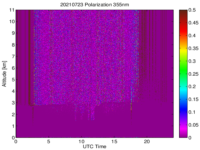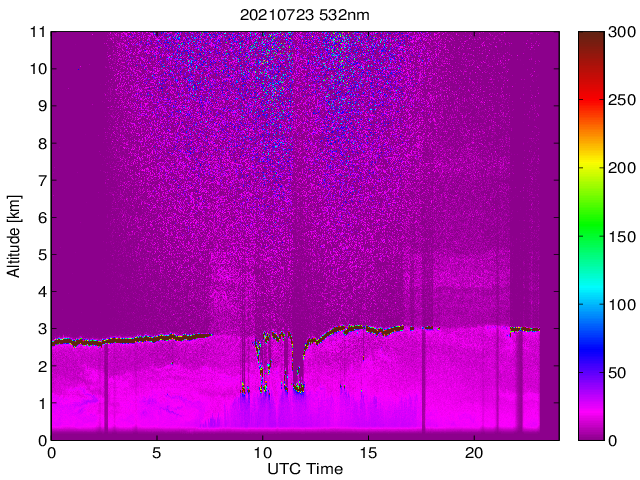Wykres przedstwia sygnał z lidar ADR dla długości fali 1064 nm w zależności od czasu i wysokości nad powierzchnią ziemi. Signał został skorygowany na odleglość od przyrządu (range corrected signal). Sygnał jest poprawny od wysokości ok 550 metrów (powyżej wysokości kompresji geometrycznej. Kolorem czerownym i brązowym widoczne są na mapie chmury.