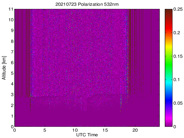 Wykres przedstwia sygnał z lidaru ADR dla długości fali 532 nm w zależności od czasu i wysokości nad powierzchnią ziemi. Signał został skorygowany na odleglość od przyrządu (range corrected signal).
