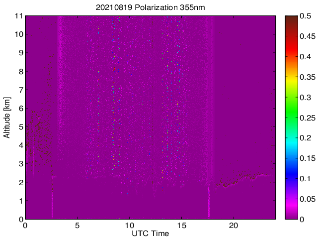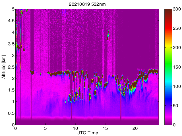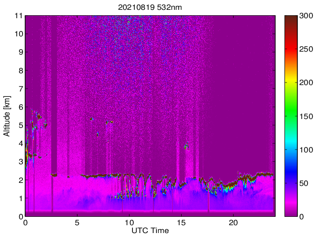 Wykres przedstwia sygnał z lidar ADR dla długości fali 1064 nm w zależności od czasu i wysokości nad powierzchnią ziemi. Signał został skorygowany na odleglość od przyrządu (range corrected signal). Sygnał jest poprawny od wysokości ok 550 metrów (powyżej wysokości kompresji geometrycznej. Kolorem czerownym i brązowym widoczne są na mapie chmury.