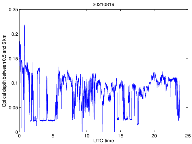 Dobowy przebieg grubości optycznej pomiędzy wysokością 0.5 a 6 km dla długosci fali 1064 nm