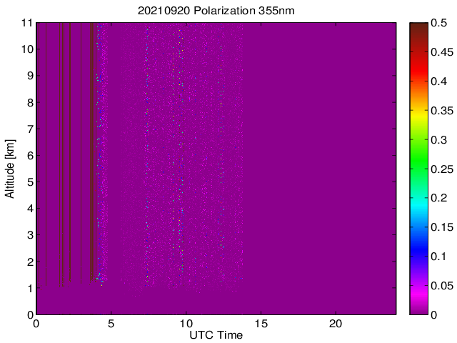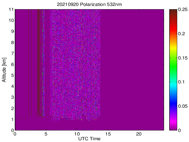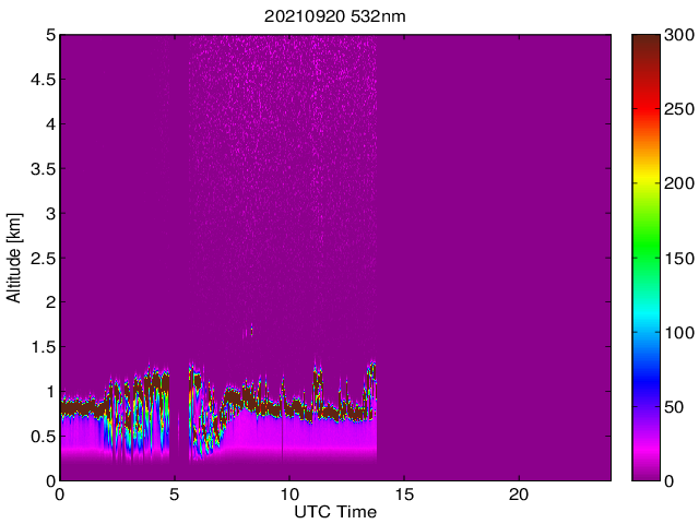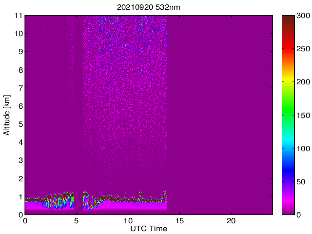 Wykres przedstwia sygnał z lidar ADR dla długości fali 1064 nm w zależności od czasu i wysokości nad powierzchnią ziemi. Signał został skorygowany na odleglość od przyrządu (range corrected signal). Sygnał jest poprawny od wysokości ok 550 metrów (powyżej wysokości kompresji geometrycznej. Kolorem czerownym i brązowym widoczne są na mapie chmury.