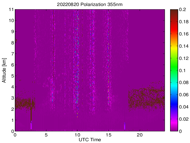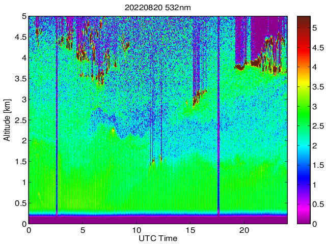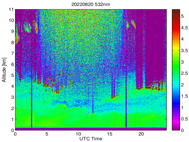 Wykres przedstwia sygnał z lidar ADR dla długości fali 1064 nm w zależności od czasu i wysokości nad powierzchnią ziemi. Signał został skorygowany na odleglość od przyrządu (range corrected signal). Sygnał jest poprawny od wysokości ok 550 metrów (powyżej wysokości kompresji geometrycznej. Kolorem czerownym i brązowym widoczne są na mapie chmury.
