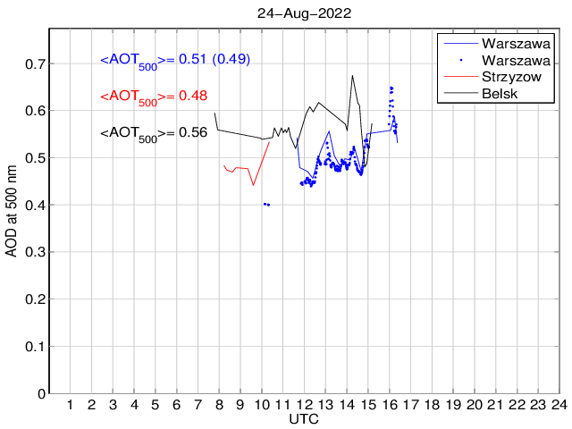 Przebieg dobowy grubości optycznej aerozolu dla długości fali 500 nm. Wielkość mierzona przy użyciu MFR-7 ShadowBand i fotometru CIMEL. Wartości podane na wykresie odnoszą się do średnich wartości za dany okres czasu.