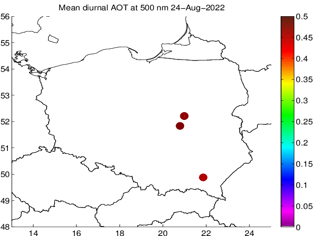 Zmiany przestrzenne grubości optycznej aerozolu dla długości fali 500 nm. Wielkość mierzona przy użyciu MFR-7 ShadowBand i fotometru CIMEL. Wartości podane na wykresie odnoszą się do średnich wartości za dany okres czasu.