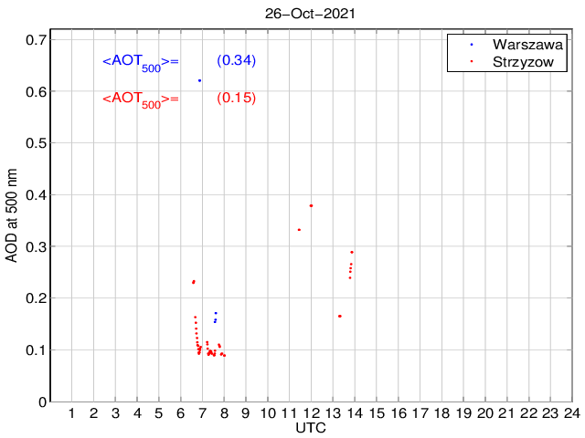 Przebieg dobowy grubości optycznej aerozolu dla długości fali 500 nm. Wielkość mierzona przy użyciu MFR-7 ShadowBand i fotometru CIMEL. Wartości podane na wykresie odnoszą się do średnich wartości za dany okres czasu.