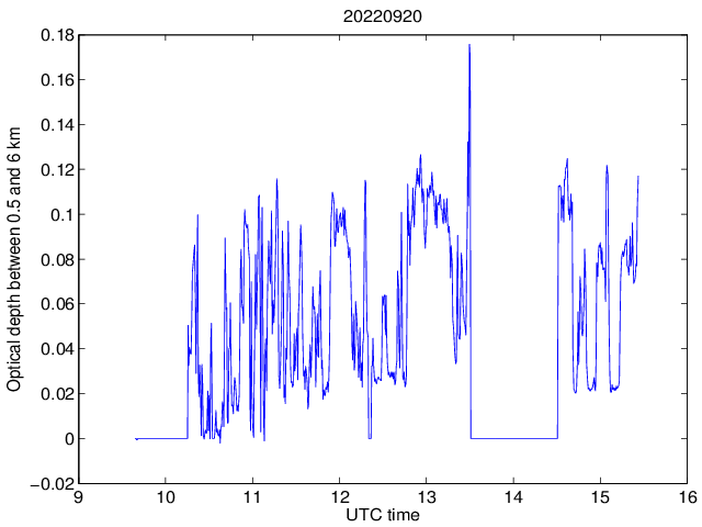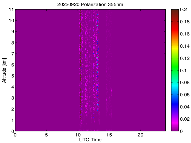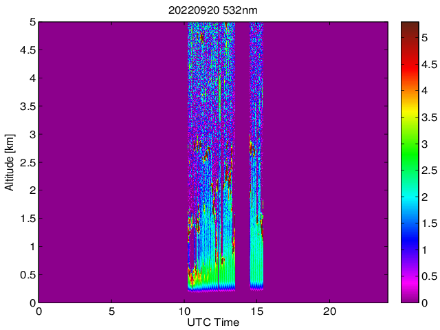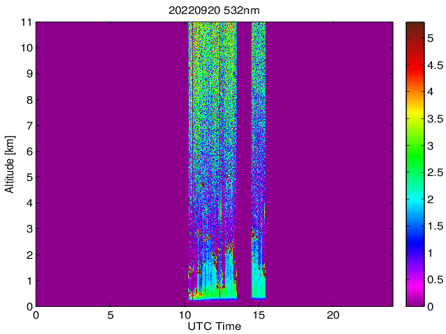 Wykres przedstwia sygnał z lidar ADR dla długości fali 1064 nm w zależności od czasu i wysokości nad powierzchnią ziemi. Signał został skorygowany na odleglość od przyrządu (range corrected signal). Sygnał jest poprawny od wysokości ok 550 metrów (powyżej wysokości kompresji geometrycznej. Kolorem czerownym i brązowym widoczne są na mapie chmury.