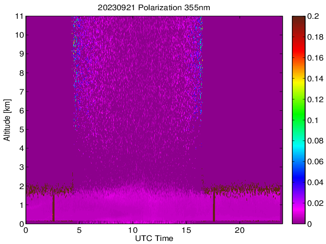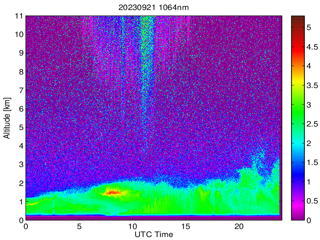 Wykres przedstwia sygnał z lidar ADR dla długości fali 1064 nm w zależności od czasu i wysokości nad powierzchnią ziemi. Signał został skorygowany na odleglość od przyrządu (range corrected signal). Sygnał jest poprawny od wysokości ok 550 metrów (powyżej wysokości kompresji geometrycznej. Kolorem czerownym i brązowym widoczne są na mapie chmury.