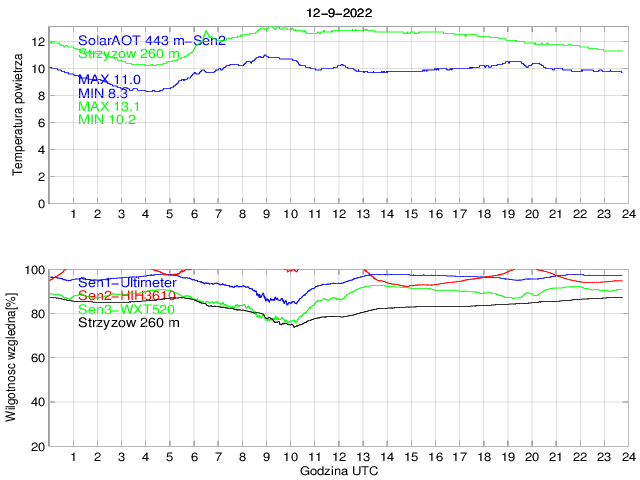 Przebieg dobowy temperatury powietrza na stacji SolarAOT (443 m) i dolnej stacji w Strzyżowie (260 m) oraz wilgotności powietrza mierzonej na stacji SolarAOT dwoma różnymi czujnikami. Różnica temperatur pomiędzy dolną i górną stacją umożliwia określenie stratyfikacji najniższej warstwy granicznej.
