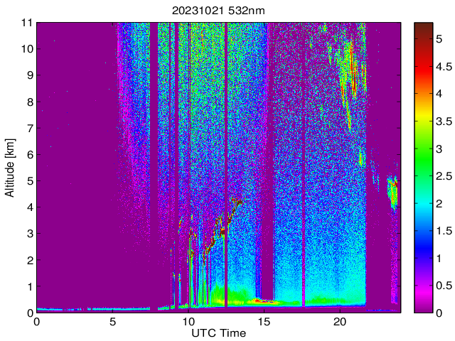 Wykres przedstwia sygnał z lidar ADR dla długości fali 1064 nm w zależności od czasu i wysokości nad powierzchnią ziemi. Signał został skorygowany na odleglość od przyrządu (range corrected signal). Sygnał jest poprawny od wysokości ok 550 metrów (powyżej wysokości kompresji geometrycznej. Kolorem czerownym i brązowym widoczne są na mapie chmury.