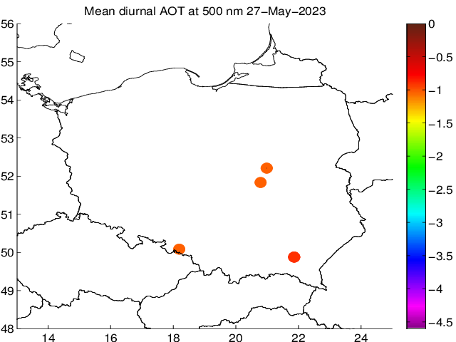 Przebieg dobowy grubości optycznej aerozolu dla długości fali 500 nm. Wielkość mierzona przy użyciu MFR-7 ShadowBand i fotometru CIMEL. Wartości podane na wykresie odnoszą się do średnich wartości za dany okres czasu.