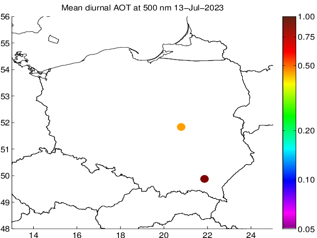 Przebieg dobowy grubości optycznej aerozolu dla długości fali 500 nm. Wielkość mierzona przy użyciu MFR-7 ShadowBand i fotometru CIMEL. Wartości podane na wykresie odnoszą się do średnich wartości za dany okres czasu.
