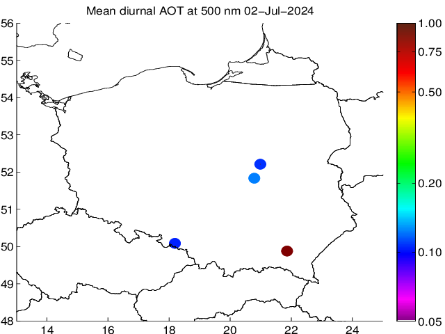 Przebieg dobowy grubości optycznej aerozolu dla długości fali 500 nm. Wielkość mierzona przy użyciu MFR-7 ShadowBand i fotometru CIMEL. Wartości podane na wykresie odnoszą się do średnich wartości za dany okres czasu.