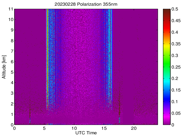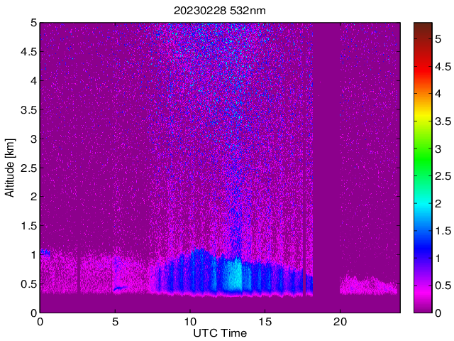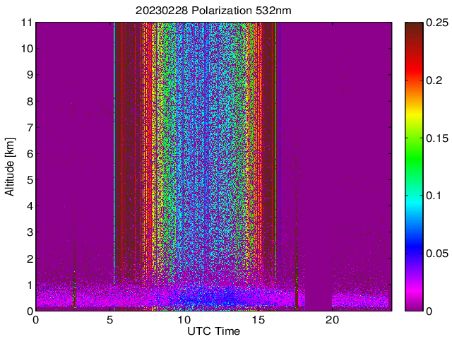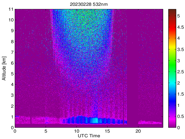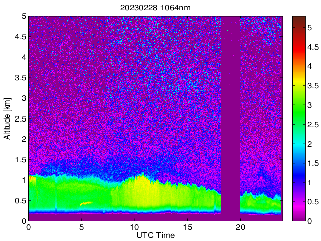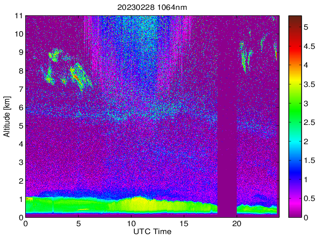 Wykres przedstwia sygnał z lidar ADR dla długości fali 1064 nm w zależności od czasu i wysokości nad powierzchnią ziemi. Signał został skorygowany na odleglość od przyrządu (range corrected signal). Sygnał jest poprawny od wysokości ok 550 metrów (powyżej wysokości kompresji geometrycznej. Kolorem czerownym i brązowym widoczne są na mapie chmury.